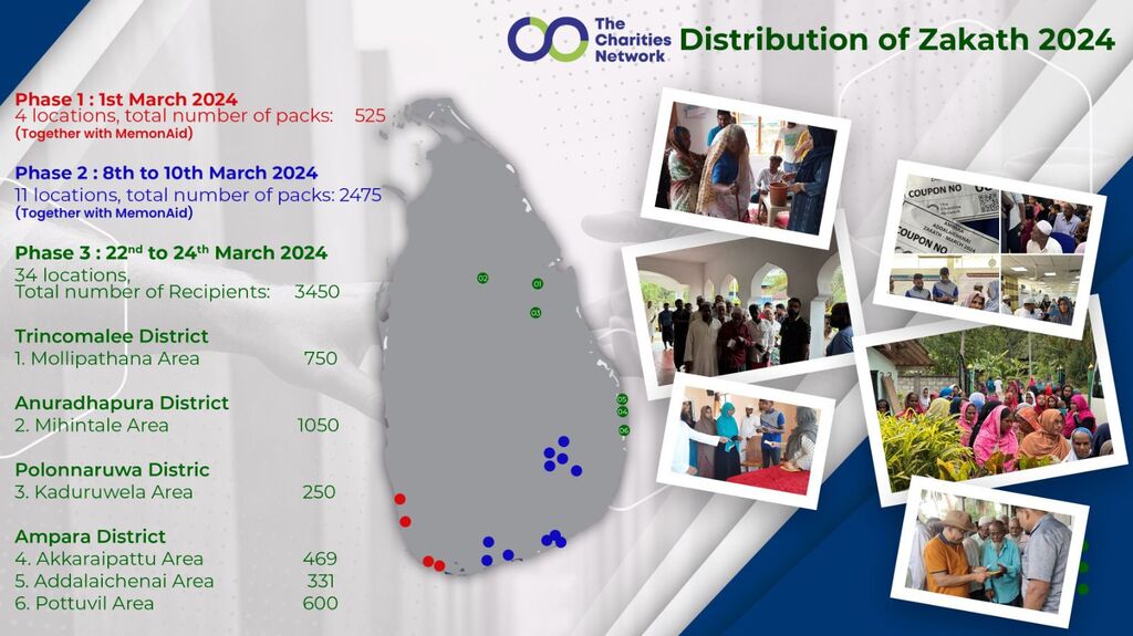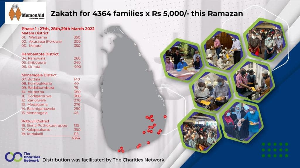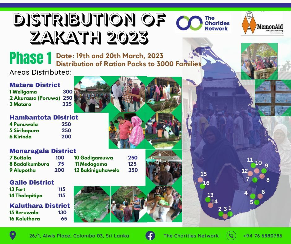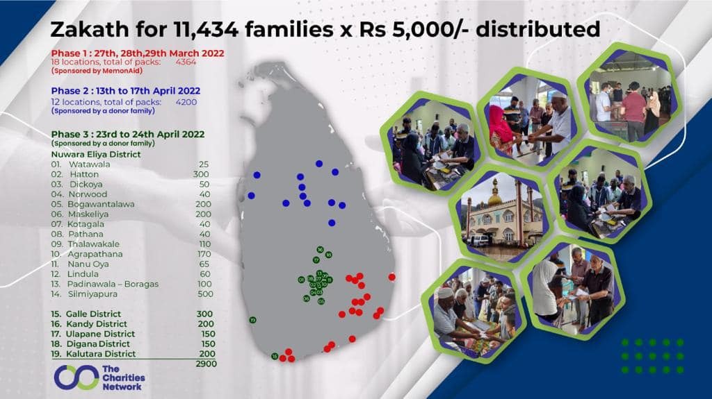 In 2022, Zakath funds were distributed amongst 11,434 needy muslim families in the following 16 districts.
